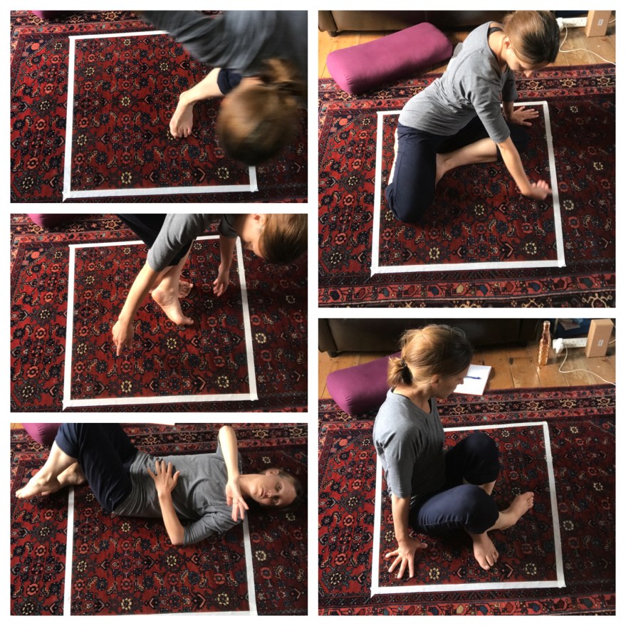 The second set of images are the resulting ‘choreographies’ captured by my phone running an app set to take a photo every 1 minute. Unlike the previous experiments, I was not able to see the framing of the space or have some sense of when a photo might be taken, resulting in a less intentional choreography. I worked on my living room carpet with white masking tape to once again draw out the framing or enframing within the frame of the camera. The framing of the collage took place post practice and was almost accidental, however the appearance of white lines both between and across each picture draws out another possibility for choreographic interplay.